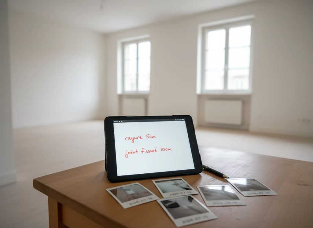 Privilégiez des descriptions mesurables : ‘tache 3×2 cm’ au lieu de ‘tache sale’. Ajoutez des photos datées pour appuyer vos constats. ‘Joint fissuré 10 cm’ est objectif, évitant litiges et retenues injustes.