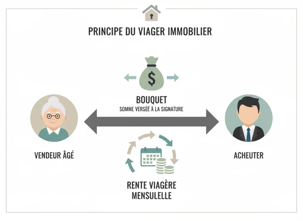 Le viager permet de vendre un bien sans connaître son prix final. Un vendeur (crédirentier) cède son logement à un acheteur (débirentier) en échange de deux flux : le bouquet (versé à la signature) et la rente viagère (paiement jusqu’au décès du vendeur). L’originalité ? L’aléa : la durée de vie du crédirentier fixe le coût total, rendant l’opération imprévisible pour les deux parties.